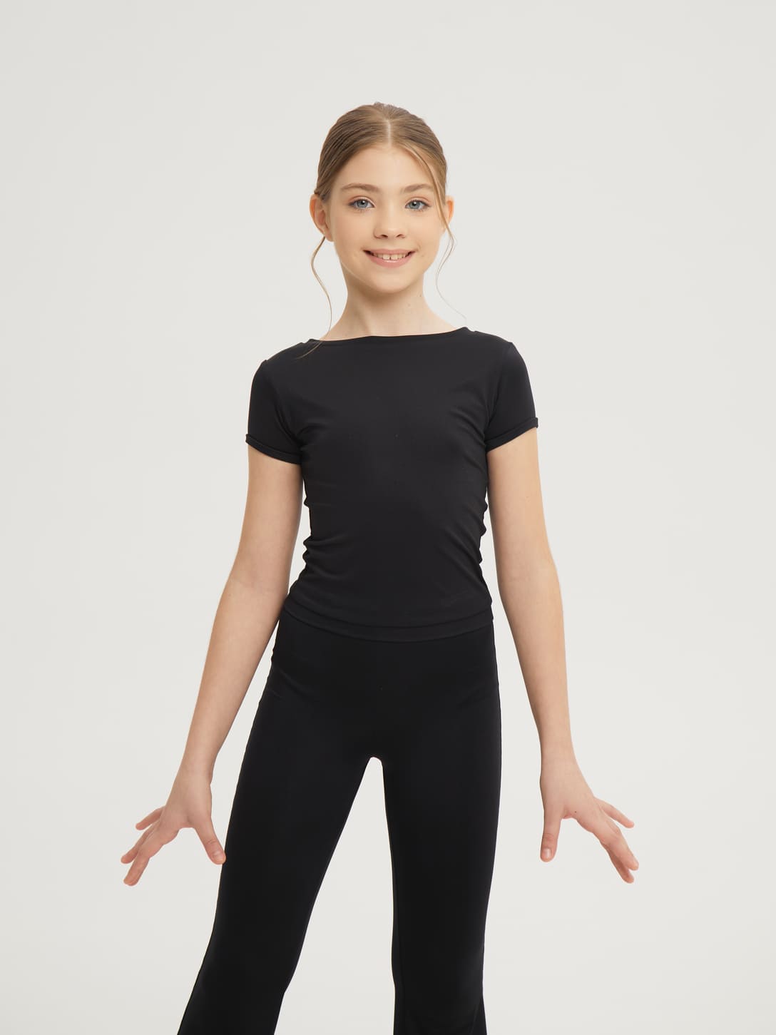 Базовый спортивный кроп-топ подойдет для современной и классической хореографии, фитнеса, тенниса, йоги, гимнастики, фигурного катания, спортзала, уроков физкультуры в школе или другой любимой активности. Облегающий фасон футболки подчеркивает все достоинства фигуры.