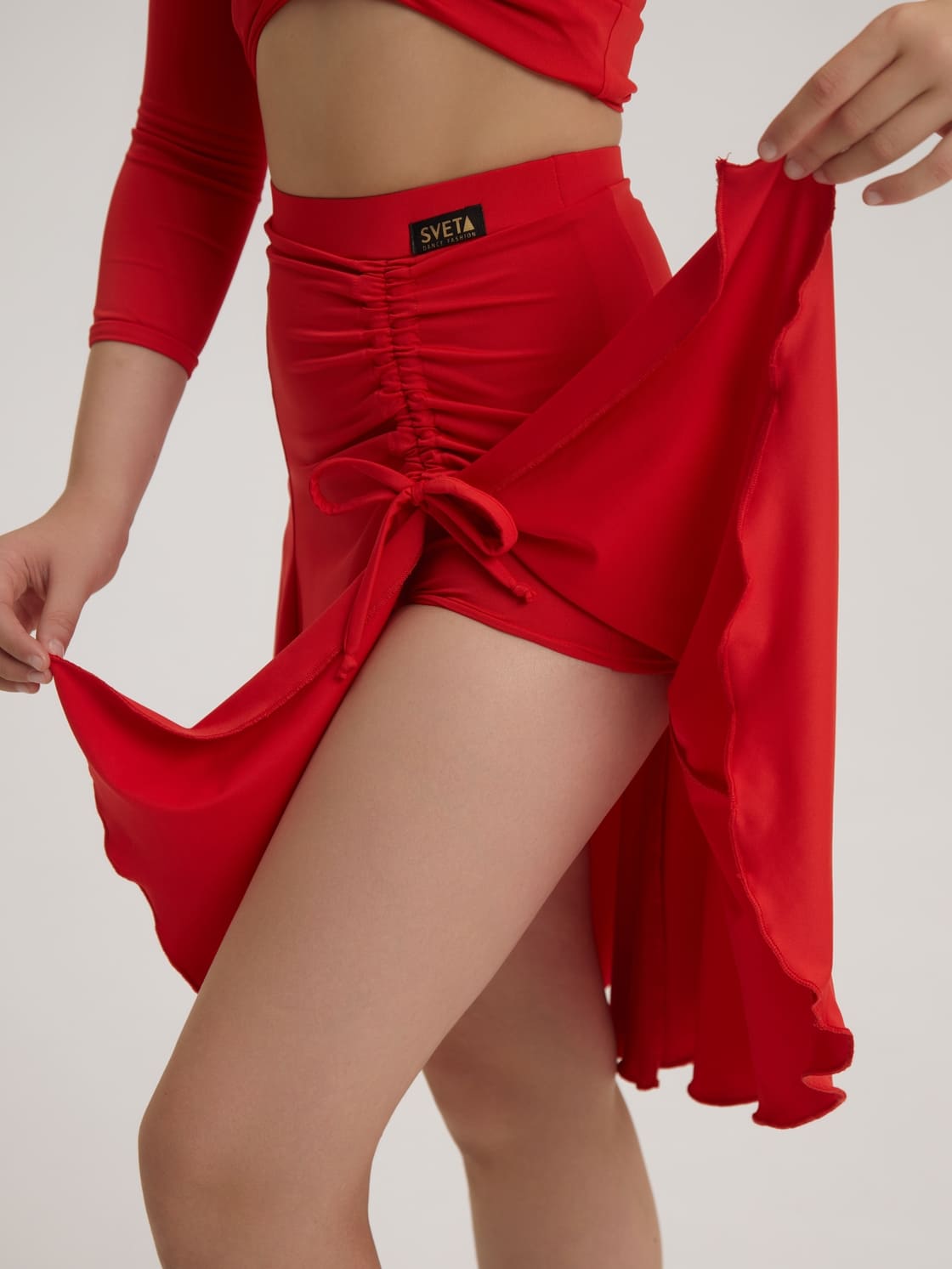 Юбка годе подойдет для тренировок по бальным танцам девочкам разных возрастных категорий: Дети-0, Дети-1, Дети-2 и Юниоры-1. Фасон подчеркнет любую фигуру. Внутри вшиты шортики для комфорта на тренировке, высота выреза на ноге регулируется кулиской.